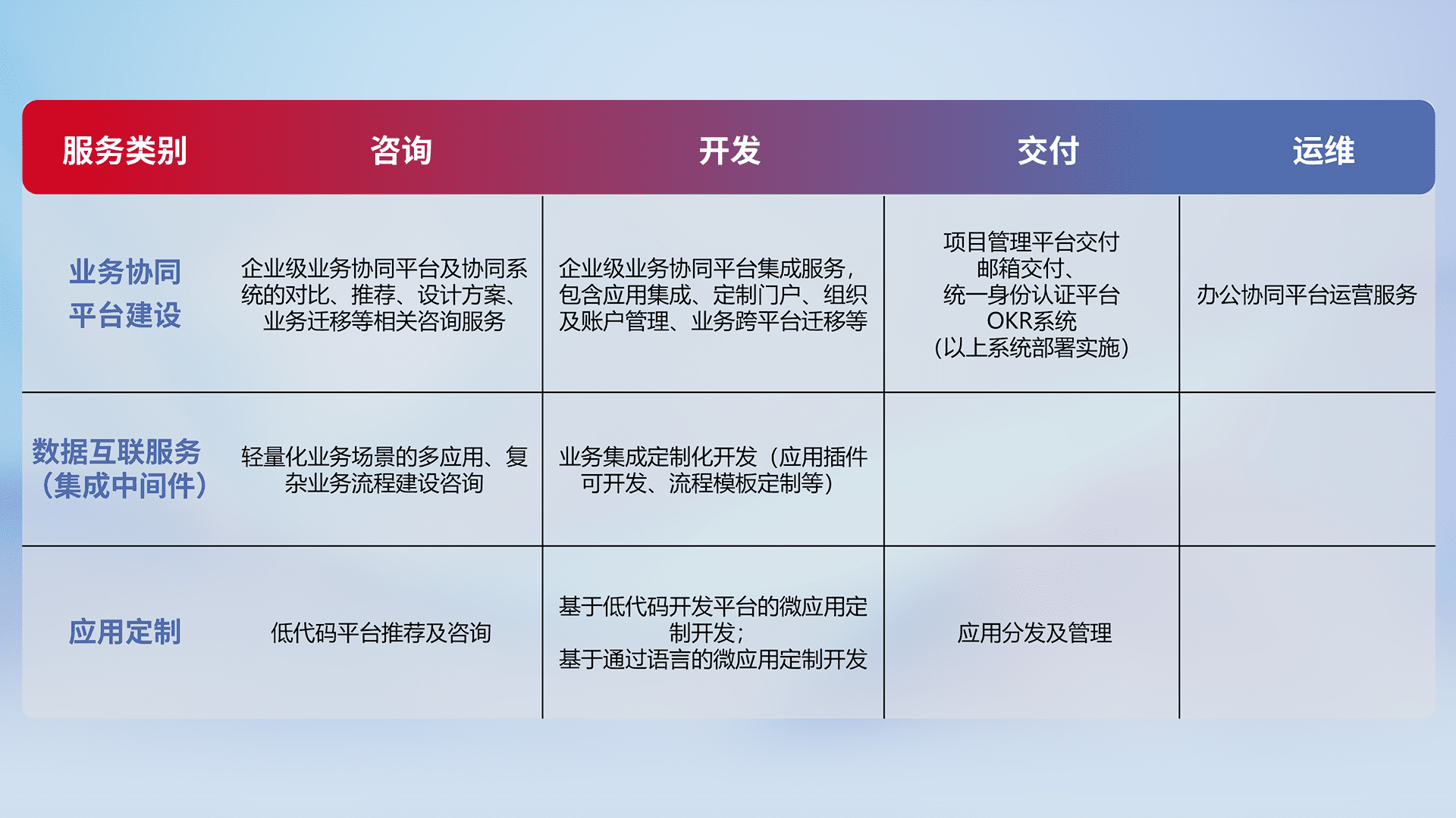 针对钉钉、、企微、、IDaas等平台级产品提供产品的规划、、方案、、交付、、、、定制化开发等服务,,,实现如统一协同办公、、智能客户服务、、、、混合会议管理、、智能数据查询、、、、等业务场景,,,,实现数字化转型。。。